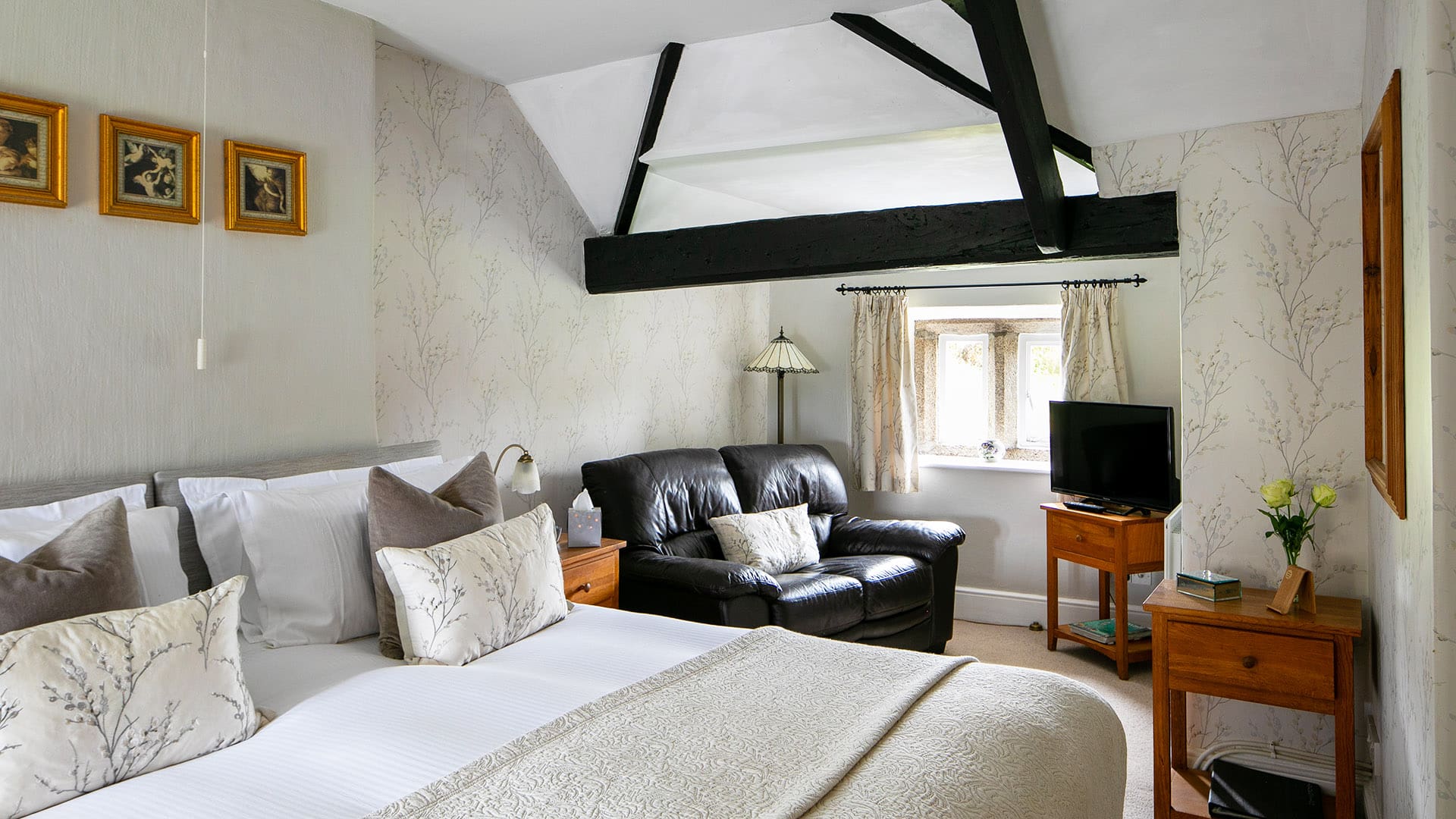 A very spacious room with a super king size bed and sofa in a lounge area to sit and read or watch television in your own private space.
